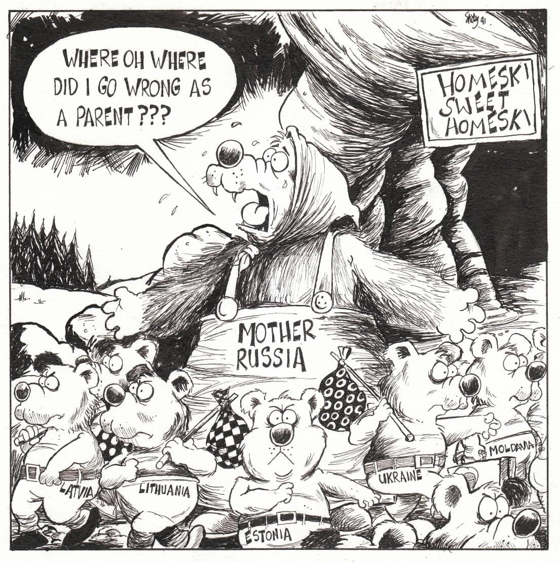 The two cartoons that stand out in my mind from those early days are the one I did of a bear (Mother Russia) being deserted by all her cubs (the Soviet satellite states) and another of a chameleon (representing South Africa) going through a state of “delicate transition” as it approached independence.